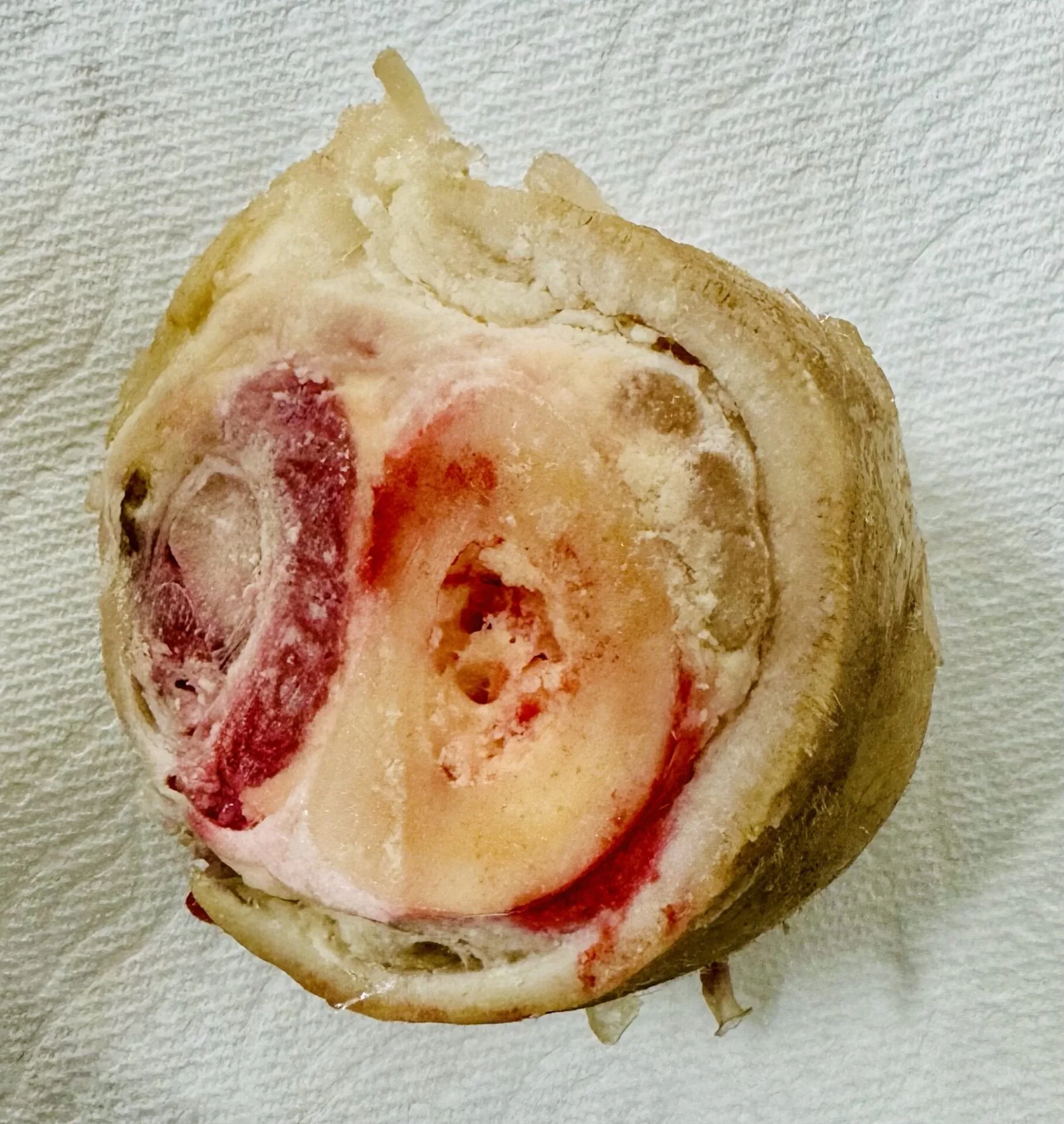 Cut from the Beef Ankle it has bone, connective tissue, skin, meat and part of the ankle ball joint.